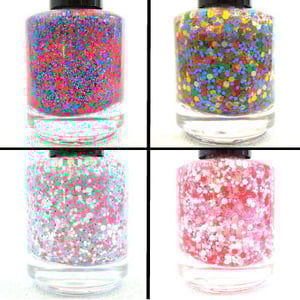 All polishes are hand blended & custom made and contain cosmetic grade glitters & mica in a suspension base. There are 2 stainless steel shaker balls in each bottle.